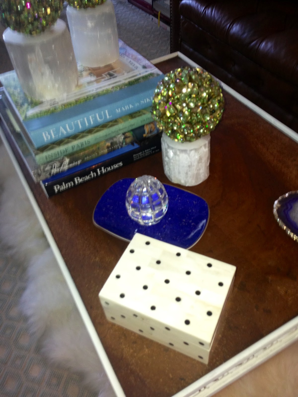 Here, I used my favorite selenite candle holders as bases for highly decorative bejeweled balls (probably intended as Christmas decorations?) - a Limoges tray from l'objet purchased at David Fruscione's shop, Republic of Decor- a stack of books, including my signed copy of Beautiful, by Mark Sikes, and a Waterford egg my old client/friend Elaine brought back from a trip to Ireland.